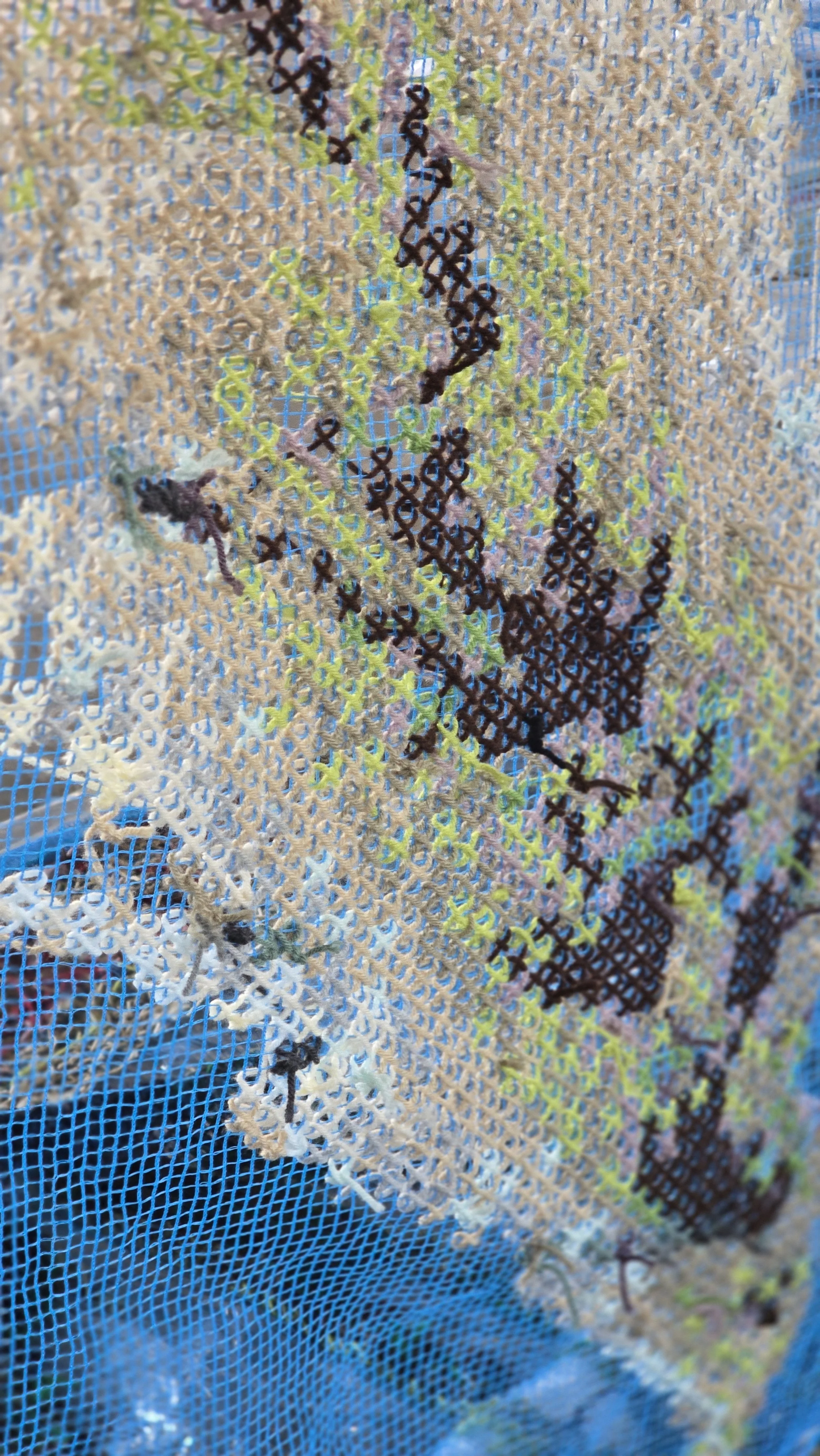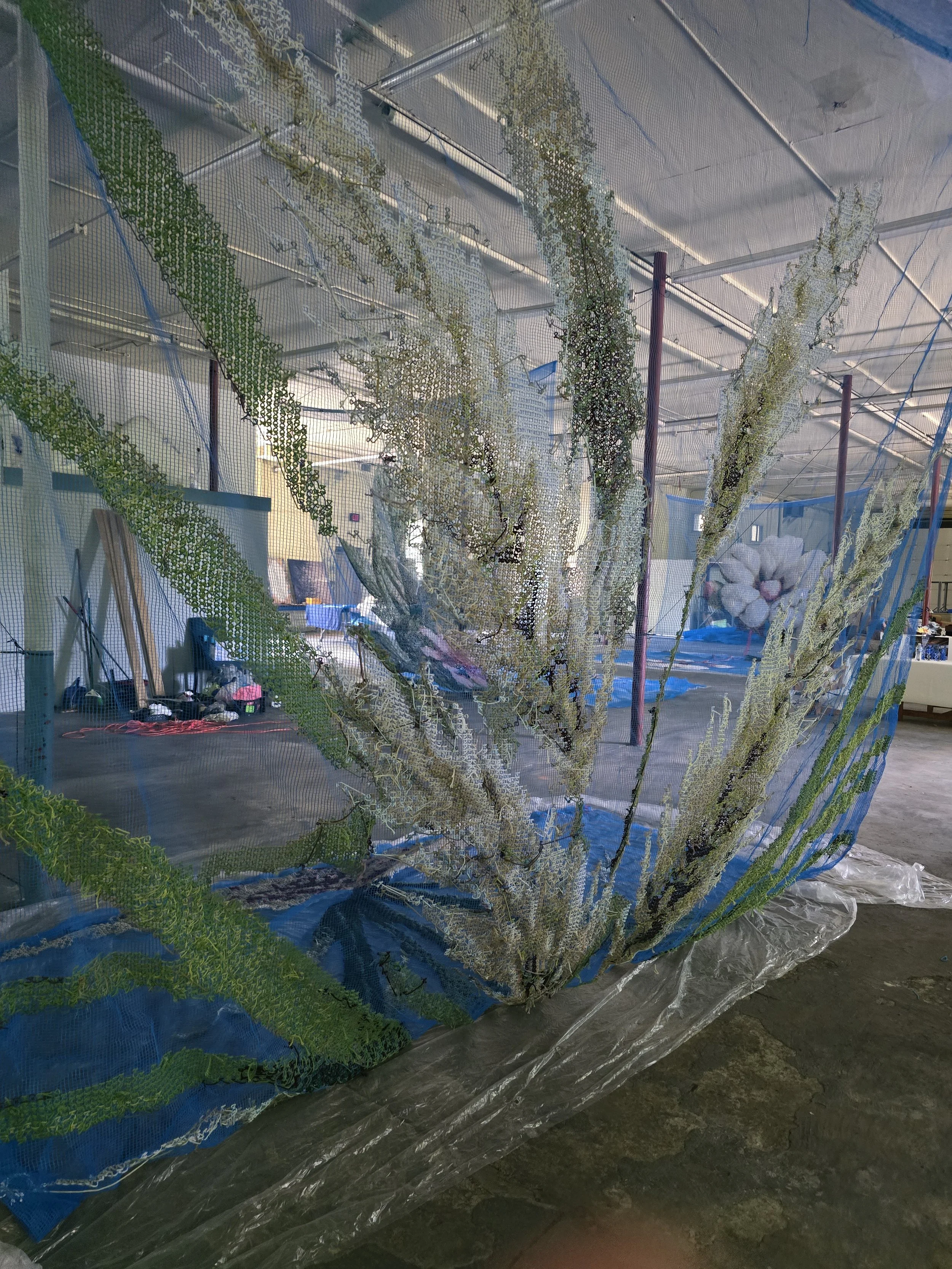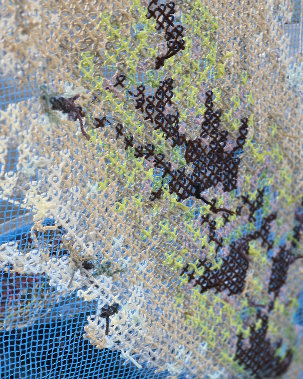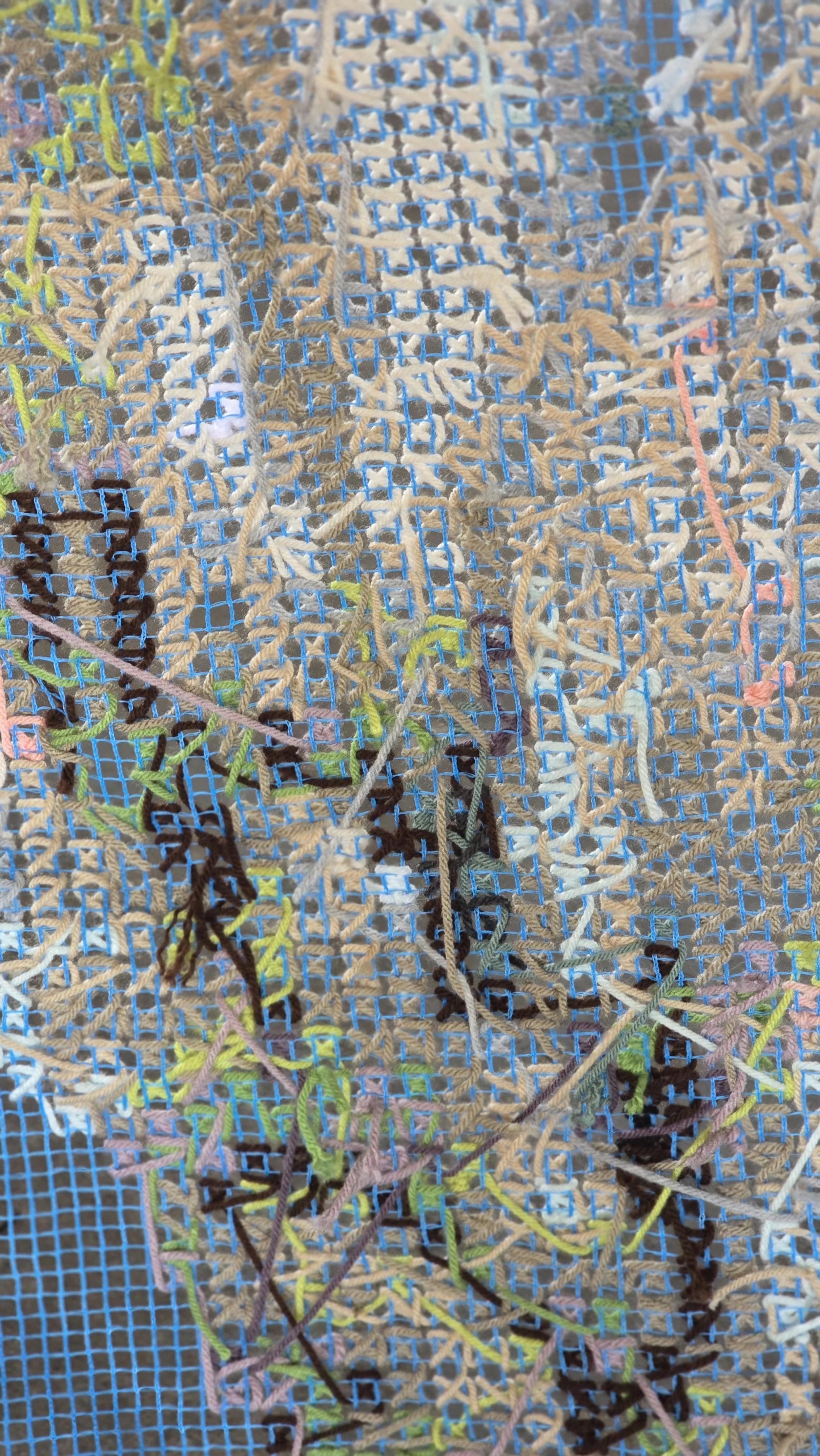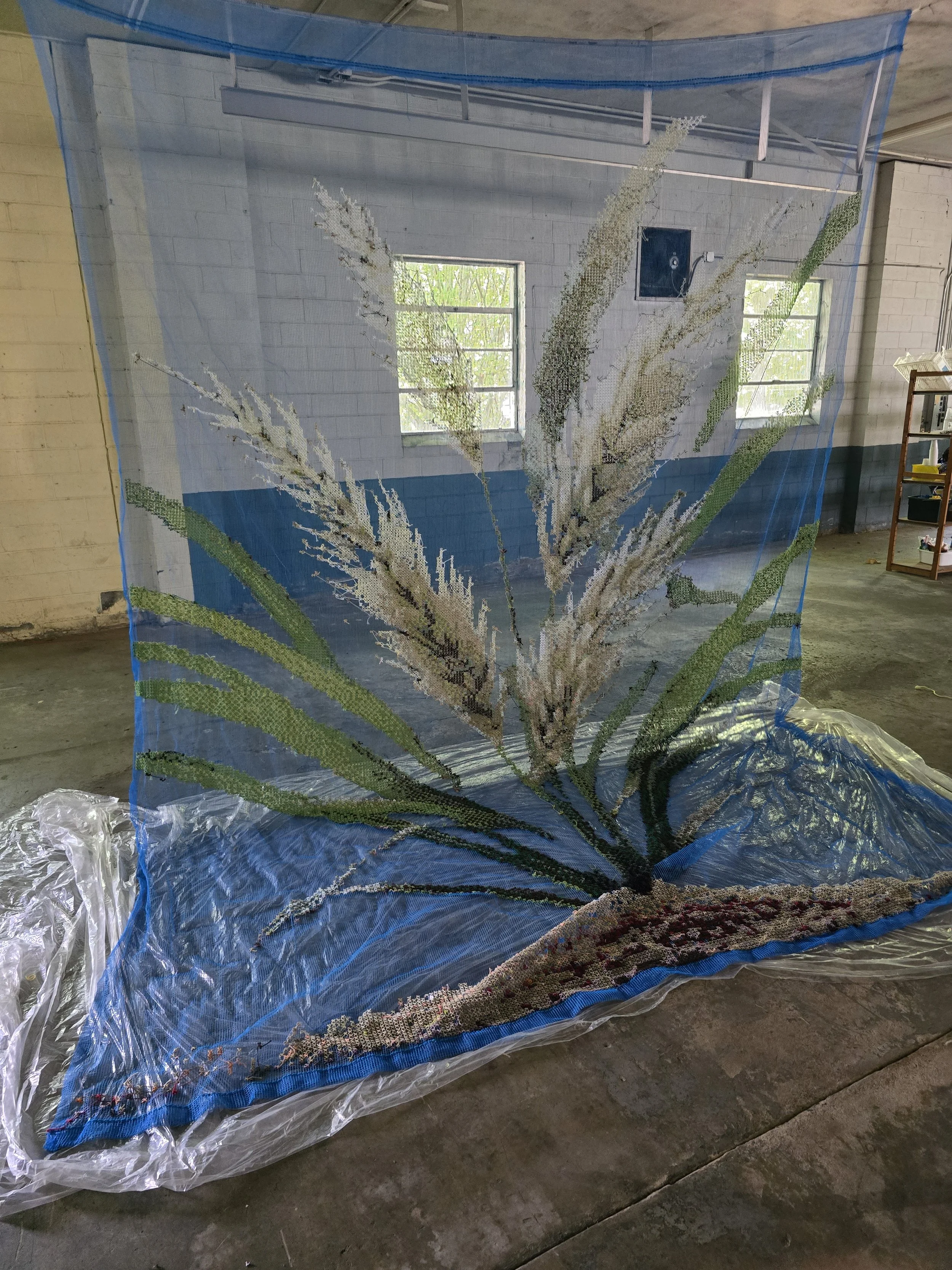 MADE THE USA is a series of large-scale cross-stitch tapestries—monumental, unapologetic, and far from traditional needlework. Each towering 20- to 30-foot piece highlights a plant that played a pivotal role in shaping the United States’ economy, fueling the nation’s ability to claim independence from Great Britain. Yet these same crops thrived on the forced labor of enslaved people, embedding a history of exploitation into the very foundation of American prosperity.